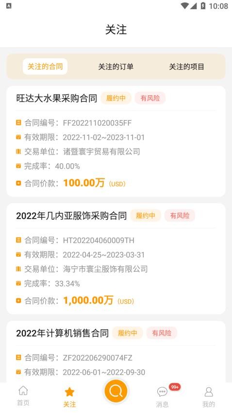 4、可以在关注页面中查看到自己所关注的各种合同、订单、项目信息;