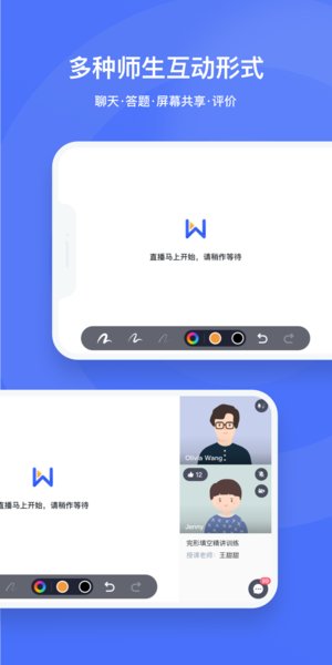 支持音视频互通、涂鸦、奖励、给麦、答题、举手等多种师生互动形式;