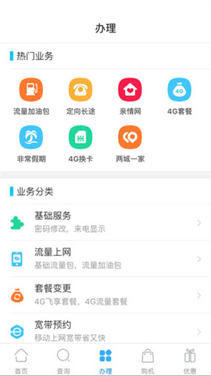 基础服务、流量上网、套餐变更、宽带预约、亲情共享、长途漫游、国际及港澳台等多项热点业务。
