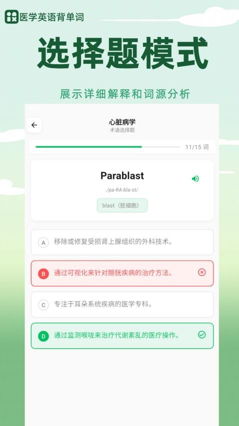 支持用户趣味学习相关的医学词汇,能够实现游戏化的学习体验,轻松激发用户的学习热情。