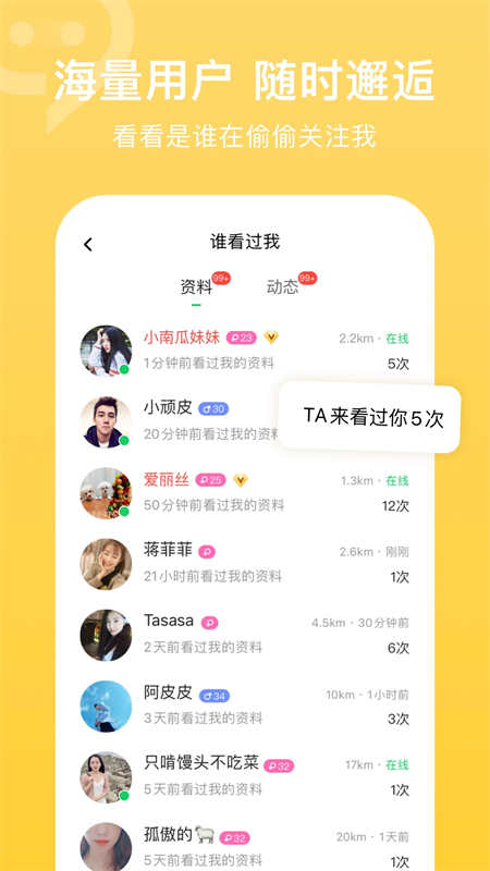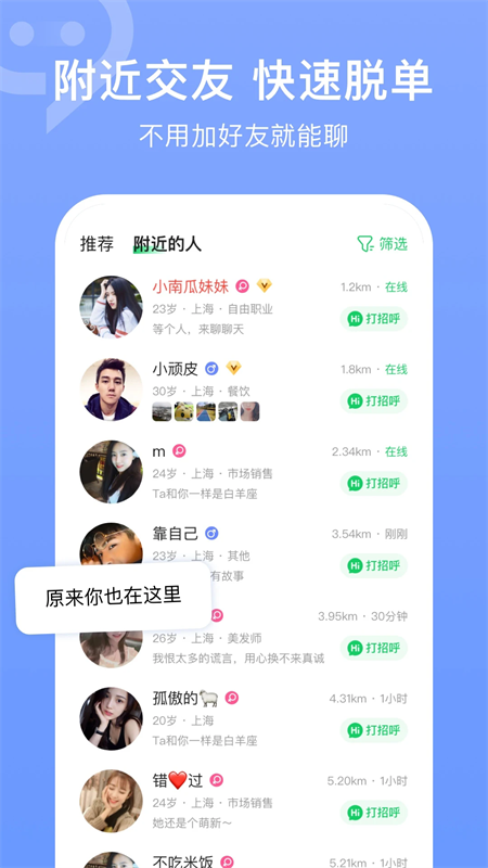 附近:为你推荐附近的人,回复率超高。