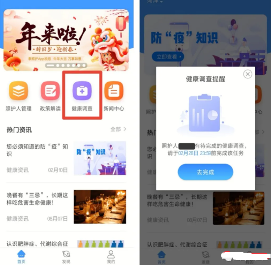 ①若当前用户当前已绑定参保人,且存在未执行的健康调查任务,则打开app后弹出健康调查提示。点击【去完成】。