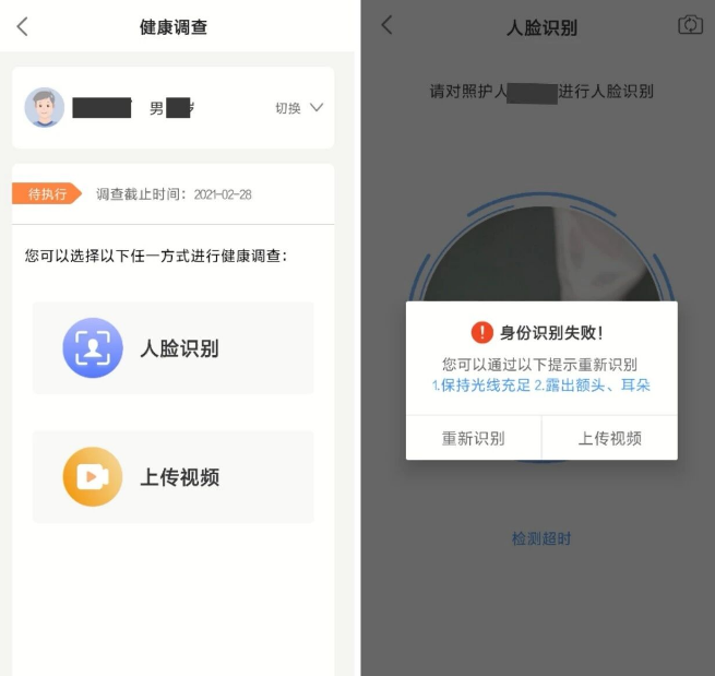 •若识别不通过则弹出提示,可以根据提示重新识别或上传视频。