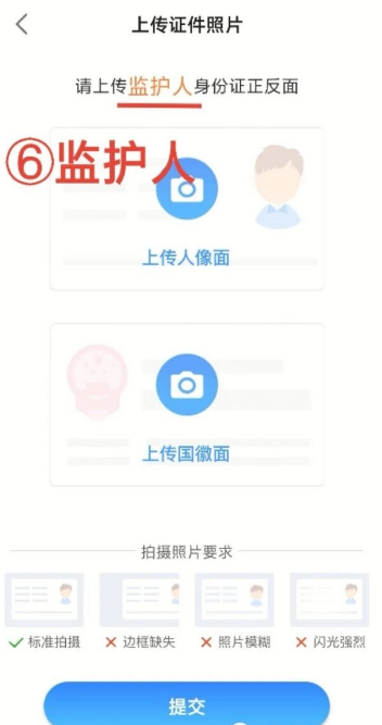 ⑥上传监护人身份证正反面(监护人=注册登录的家属)