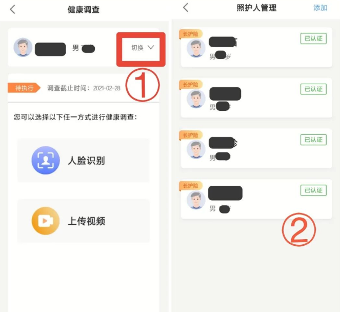 ①可在【健康调查详情页】的顶部点击“切换”,即可转到【照护人管理】页面。