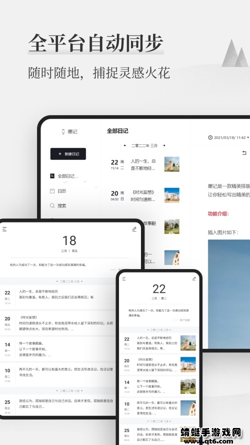 墨记app是一款精美排版的日记、笔记应用,拥有设计简洁、简单易用的特点,却同时拥有强大的功能,进行精美排版,笔记应用,图文混排,文字排版,PDF到处等多种功能。墨记采用安全加密方式存储,保障日记数据安全,仅自己可见,保护用户隐私安全。