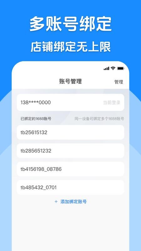 支持用户有效实现账号管理,绑定自己的店铺账号来进行管理,添加多个账号。