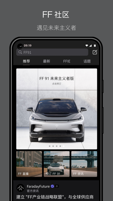 “FaradayFuture”官方微信公众号称,法拉第未来今日宣布推出全新的强交互性的FF Intelligent App,用户可以在该应用程序上预订FF 91,并与FF社区进行互动。
