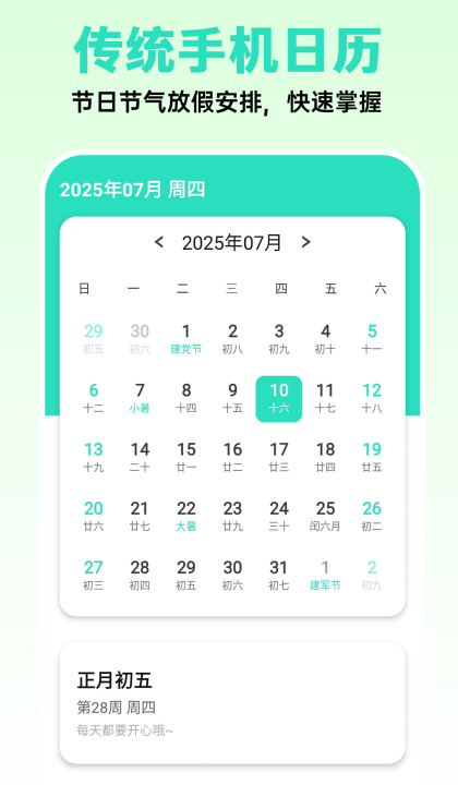 2、传统手机日历:节日节气放假安排,快速掌握。