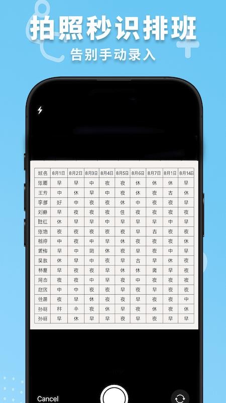 2、对着纸质版排班表拍摄,可帮助你智能识别排班,方便在手机上查看;