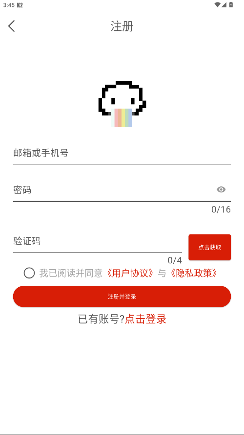 3.输入手机号/邮箱号、验证码、密码后点击注册并登录即可。
