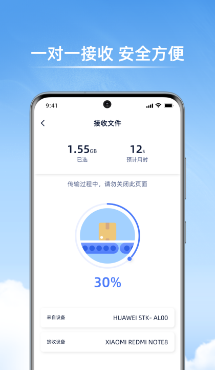 2、完成连接可直接在应用中选择文件发送,在新设备一键接收即可保存;