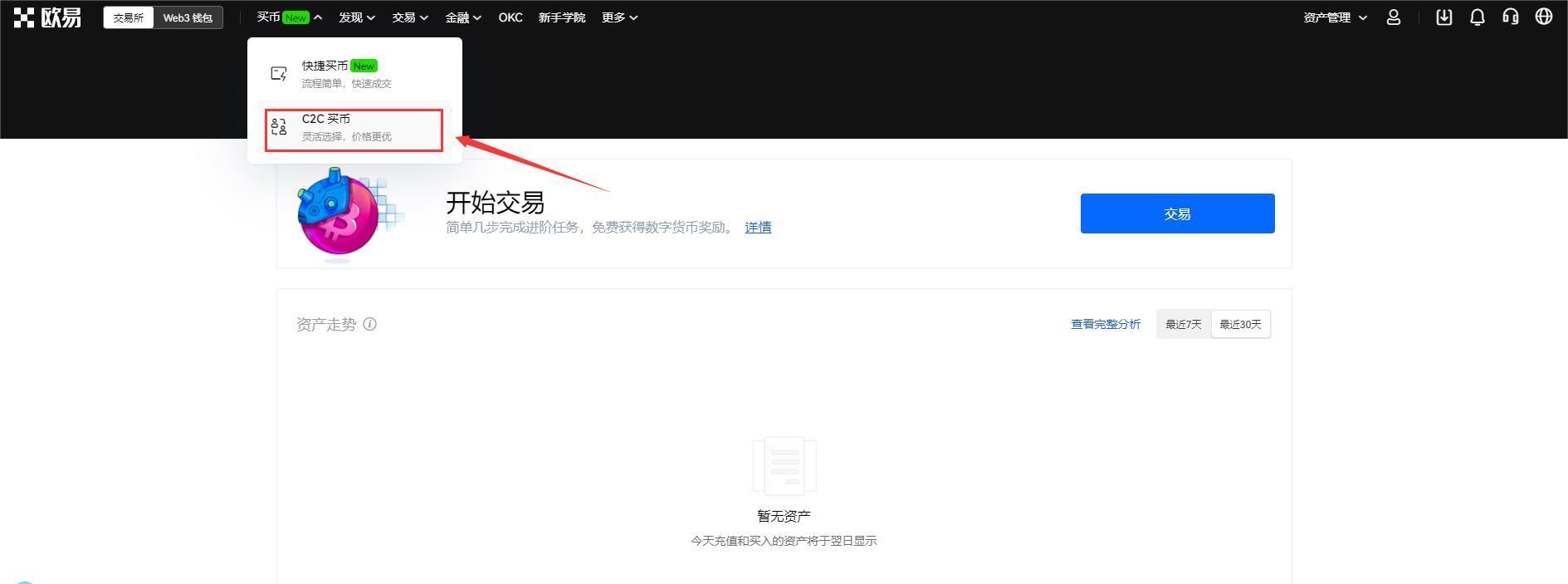 6.打开C2C交易,在买币页面,点击打开C2C交易。