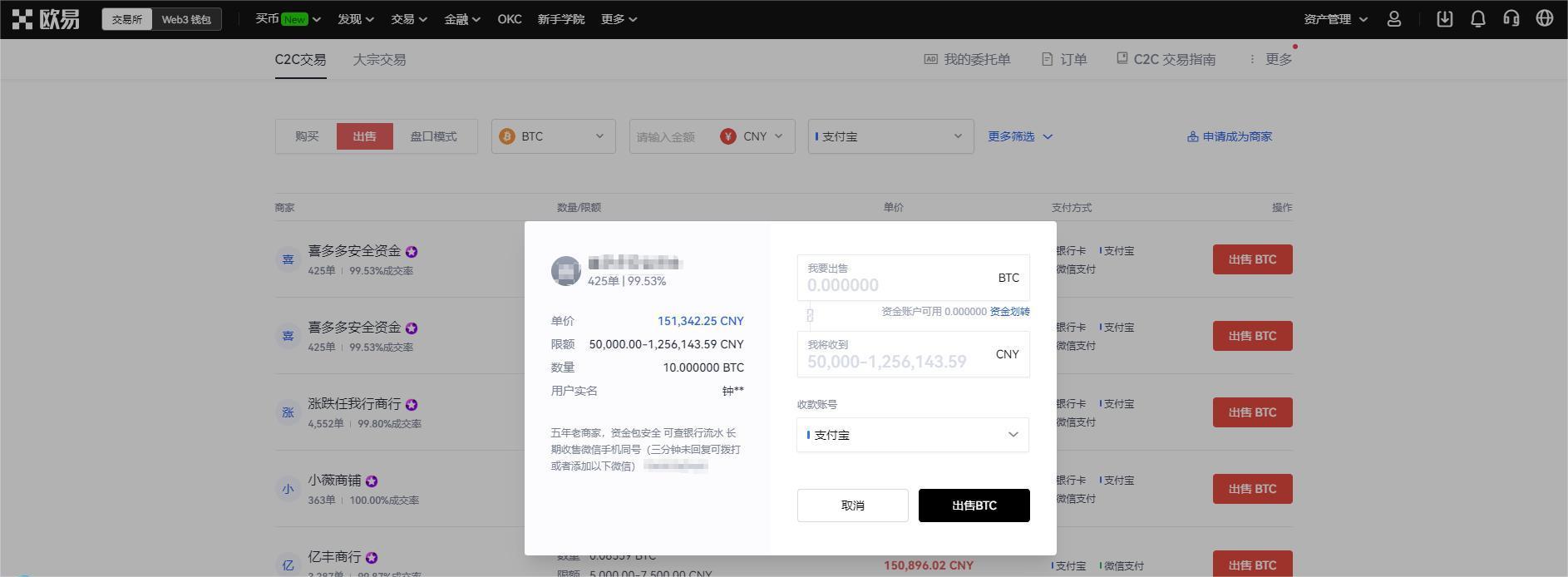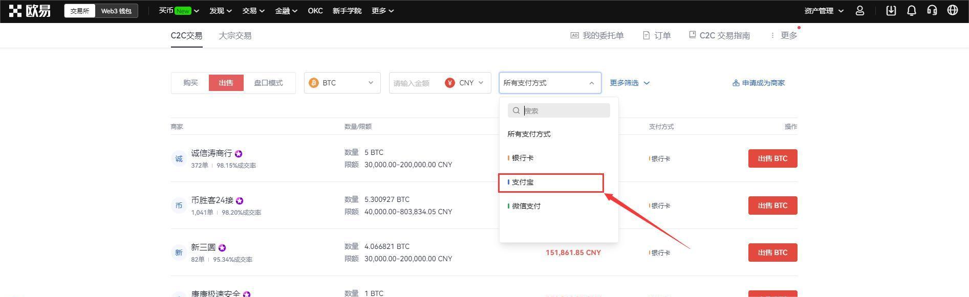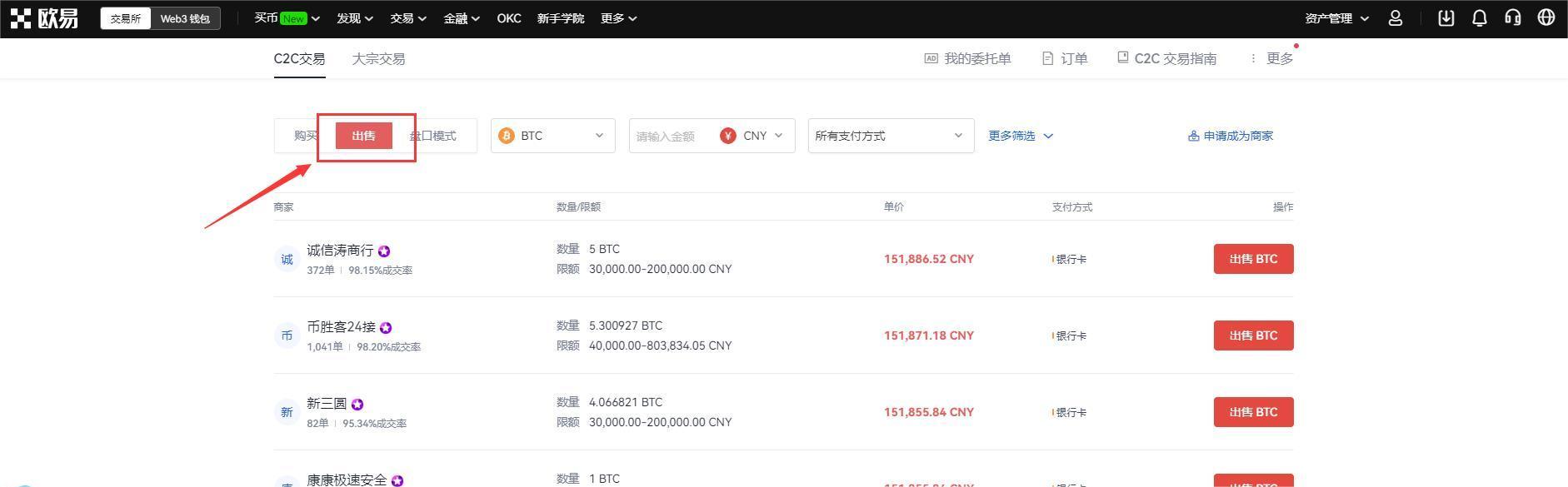 7.选择BTC交易,在C2C交易,我们以BTC为例,选择出售BTC交易。