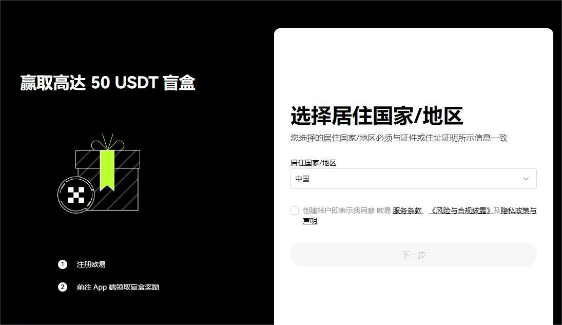 3.选择居住国家/地区,勾选服务条款、《风险与合规披露》及隐私政策与声明