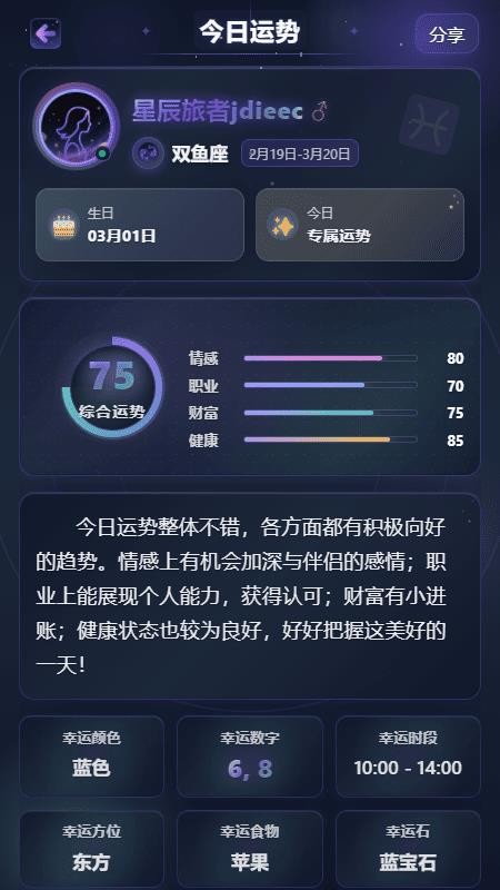 星运日记app支持用户趣味探索自己的内心,可以深度探索解析,实时进行心灵倾诉,更好的聆听疏导用户的情绪,帮助用户实现专业的心理测评,深入了解自我,更好的进行性格分析;而且用户也可以对相关的星象文化进行分析,详细分析解读,实时进行性格匹配。