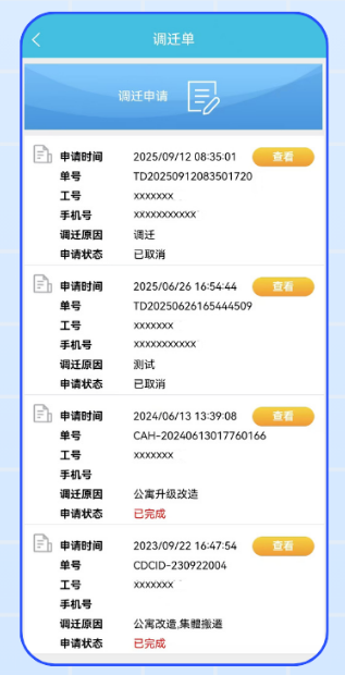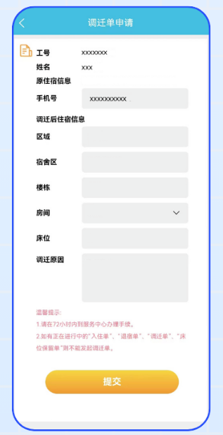 下载安装并打开寓+app,选择“住宿”→“调迁单”