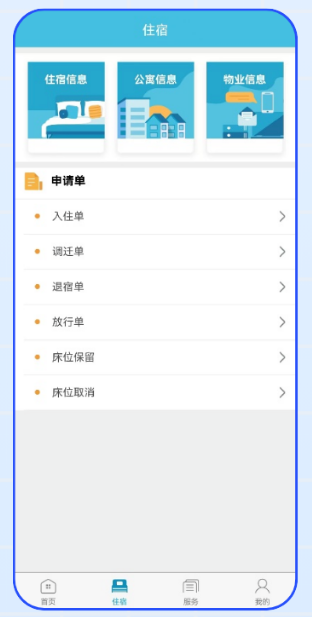 住宿管理:可自行查询公寓信息、物业信息、管家信息、宿舍活动、室友信息、入住记录、退宿记录、住宿积分,可在线申请宿舍调遣可进行自主选房。