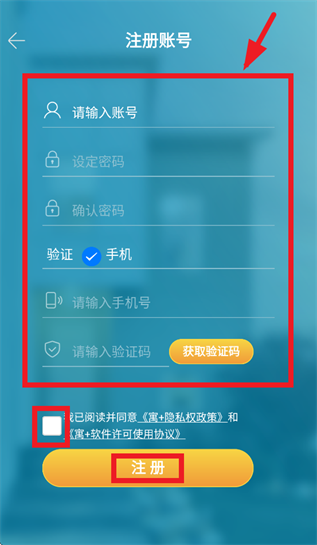 根据要求填写相关信息,勾选我已阅读并同意《寓+隐私权政策》和《寓+软件许可使用协议》,点击注册即可