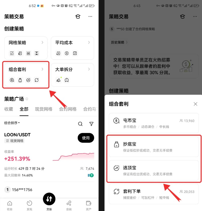 1.打开App,点击【交易】,选择【策略】,在【组合套利】里选择【抄底宝】/【逃顶宝】