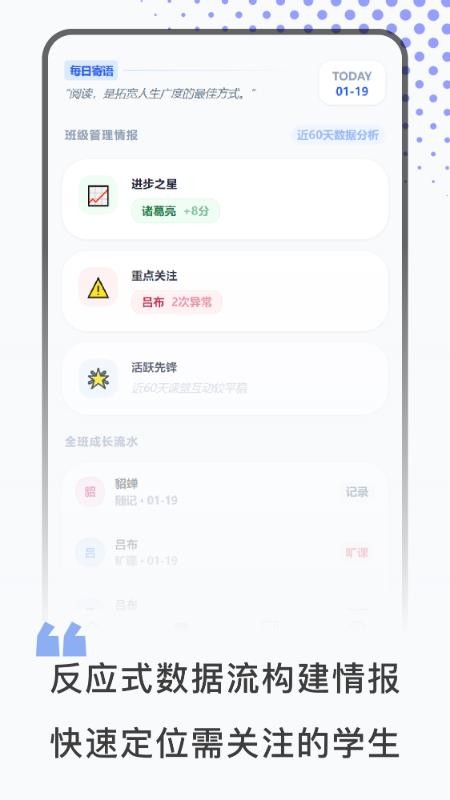 班级管理官网版app是一款专为用户提供智能高效的班级管理工具软件,软件支持用户轻松管理班级,这里展示了全面清晰的班级数据,方便用户清晰总览,更好的掌握班级的基础情况,就可让你一站式管理,实时提升用户的管理效率,轻松高效管理。平台还支持用户灵活录入学生的健康成长片段和数据,对其可以批量录入,快捷新增学生档案信息记录,以便可以统计分析学情,清晰查看班级学生的学情;此外,班级管理最新版还会帮助用户智能生成学生评语,自动生成个性化的评语,轻松发布对学生的评价,有需要的用户就赶紧来本站下载使用吧!