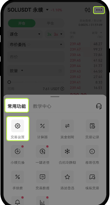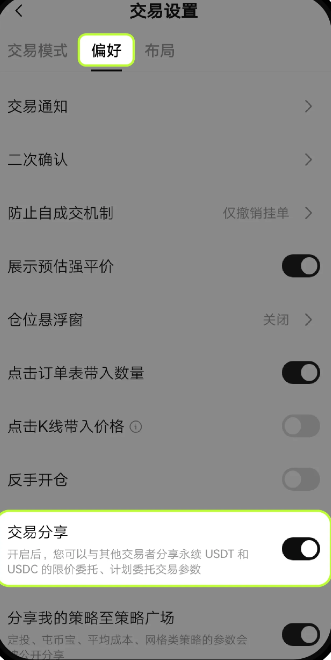 在交易页面,点击右上角设置图标,选择【常用功能】-【交易设置】-【偏好】,打开【交易分享】功能。