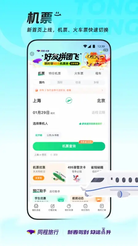 特价机票天天有,最低1折起;价格透明,大额优惠券天天领;免费选座,在线值机,随时掌控航班最新状态;线上退改更便捷,退改签不收取额外费用。