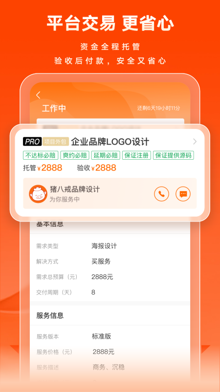猪八戒兼职平台app可以发布您的工作需求,您有任何问题都可以在这里提出,您可以在这里寻找各种创意、设计、网络营销方案,通过这些来挣钱,总体来说就跟58同城一样,是一个神奇的网站!