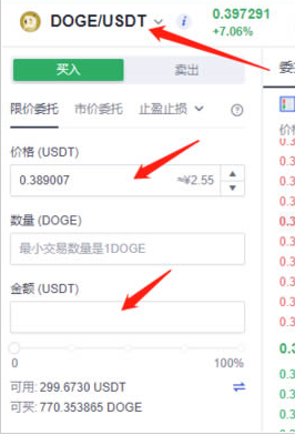 买入狗狗币,填写价格,如目前是0.397,但你想在0.38USDT价的时候购买,价格填写0.38USDT即可