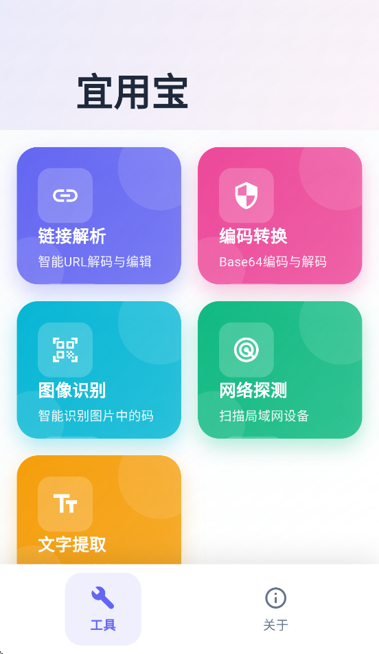 宜用宝免费下载是北京幂乘科技有限公司倾情推出的一款智能工具合集应用,软件拥有链接解析,编码转换,图像识别,网络探测,文字提取等等丰富功能,可以帮助用户更好的工作生活,觉得不错的朋友欢迎前来下载使用。