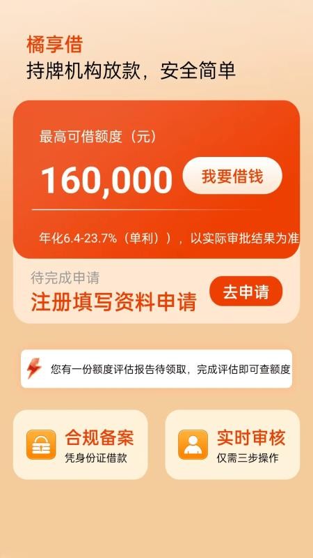 橘享借APP最新版这是一款专注于分期借贷和智能消费功能服务的应用软件,在这里能够为用户提供智能的分期借贷方案,所有的借贷项目服务都是安全真实,能够帮助用户灵活借贷高额分期款项,软件内置多种不同的分期借款方案,用户可以根据自身情况合理选择适合的借贷分期模式,让用户还款压力更小,有效避开高风险的借贷方案;除此之外,在橘享借官方版软件APP当中借贷放款机构都是绝对安全正规,只需要填写申请资料即可快速享受高额贷款;对这款程序感兴趣的用户朋友们可以直接来本站下载体验使用!