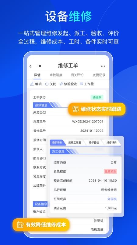 1、进入到软件首页中找到设备维修功能,对各种维修工单及时办公处理;