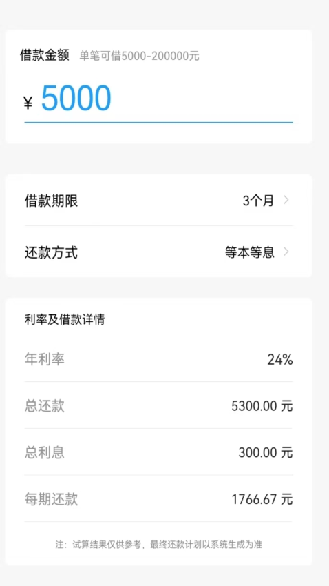 用户可以自由选择借款金额,可根据个人能力选择借款金额进行在线借款操作。