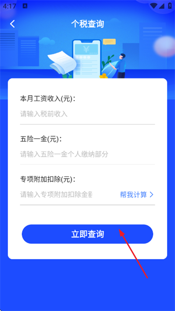 3、输入本月工资收入、五险一金以及专项附加扣除金额,最后点击立即查询即可。