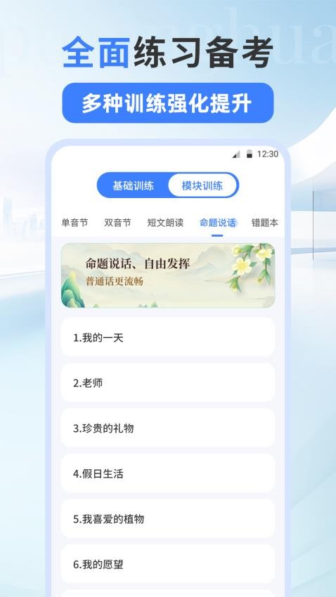 帮助用户全面学习备考需要的普通话考试,这里多种训练就可以助力用户实现强化提升。