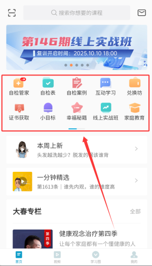 大春之道app下载安装是陕西大春文化传播有限公司倾情推出的一款健康服务平台,平台拥有首页,视频,学习圈,我的等板块,涵盖了自检管家,自检表,自检案例,互动学习,证书获取,幸福秘籍,家庭教育等等丰富功能,可以帮助用户及其家庭更健康生活。