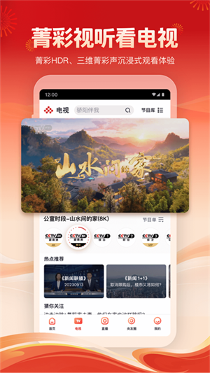 1、为用户呈现央视所有频道及多个上星卫视的电视节目直播,并为用户推荐热播和相关内容,下方为用户推荐当前频道的精彩内容。还可以使用节目单功能快速预约或回看各频道播出内容。