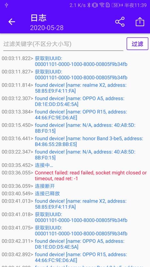 3.支持根据设备名称、mac地址、信息强度、是否已收藏等条件过滤搜索结果。