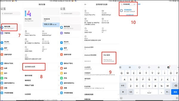 4.回到【设置】,点击【我的设备】-【全部参数与信息】打开后多次点击【MIUI版本】,直到提示已经打开【开发者选项】,打开搜索框输入【开发者选项】搜索;