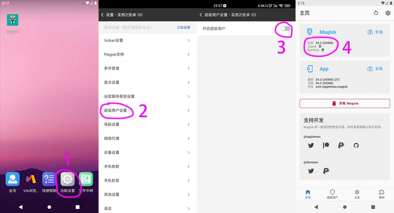 2、功能设置 C 超级用户设置(开启)- Magisk支持(开启)- Vulkan设置(开启)