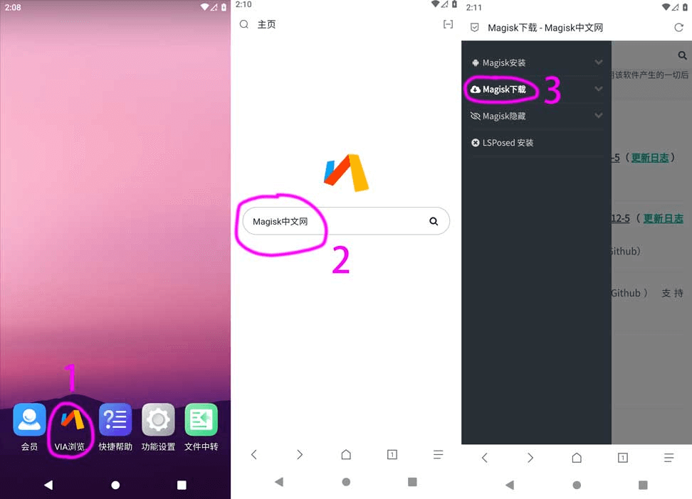3、打开Via浏览器 C 搜索 Magisk中文网 C 下载稳定版Magisk C 安装Magisk