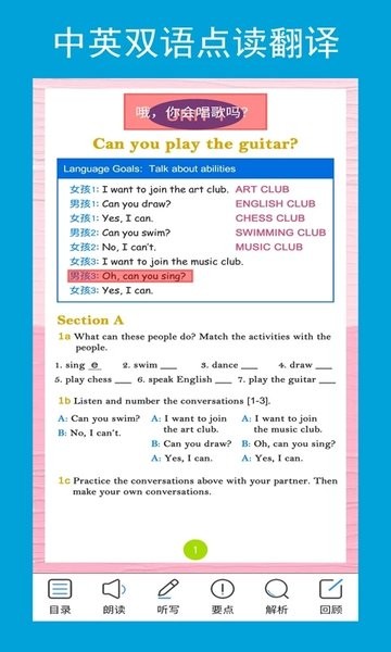 新目标英语七年级下册电子课本点读app自带中英双语点读翻译工具,所有的章节均与课本保持同步,还有定时的单词听写强化训练,重点的语法语音讲解更透彻!
