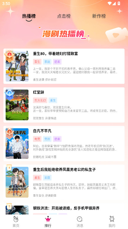 3、在排行页面,有热播榜、点击榜、新作榜等不同类型榜单,方便用户发现热门作品。