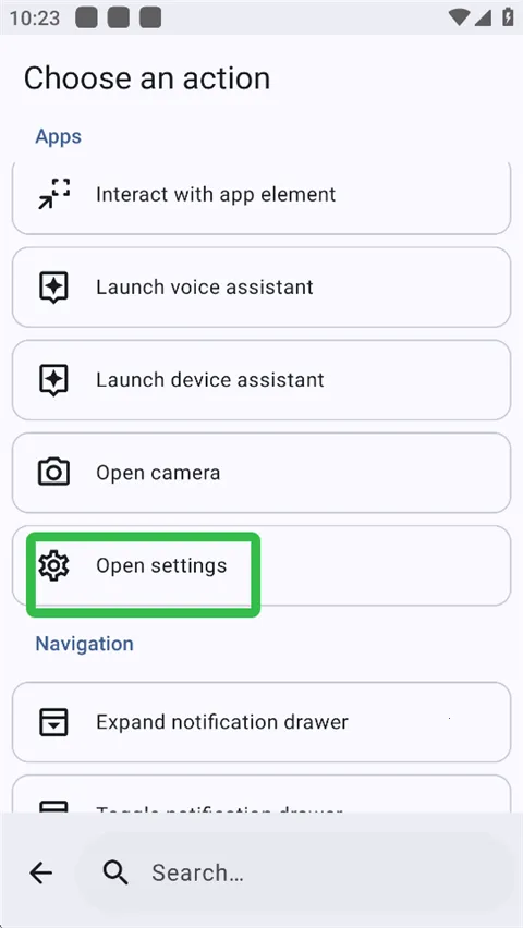 5、软件给出很多动作,在此我们选择【Open settings】打开设置,用户也可以下滑选择其他动作。
