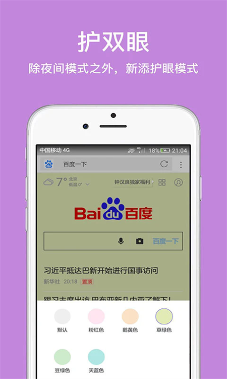超低内存占用,极速轻巧。支持各大主流搜索引擎。只提供每日精选新闻,极简设计风格,没有广告、推送和过度新闻,大大的节省了您的上网流量,节省了手机内存资源,给您一个绿色的浏览器,还您一个简洁的上网环境。