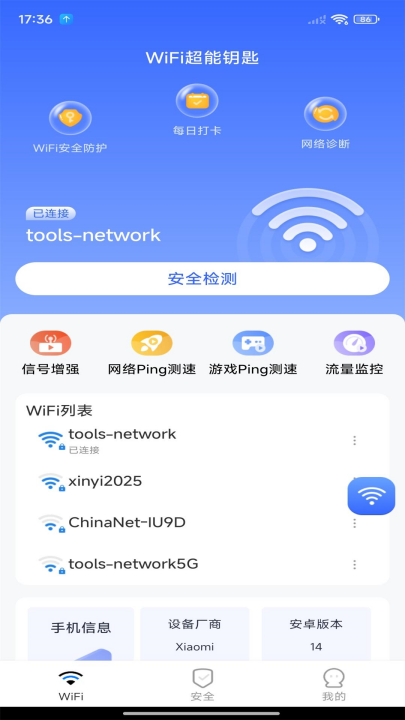 1、WiFi检测:具有WiFi检测功能,快速检测附近的WiFi并为你显示WiFi列表。