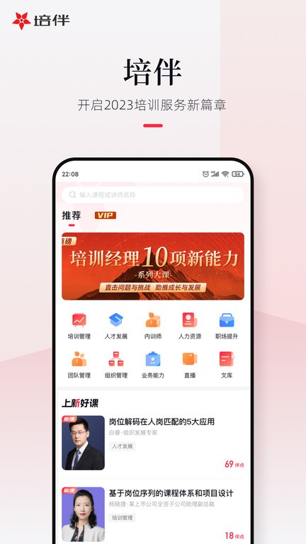 培伴App设有直播、在线好课、内训好课、案例库、企业专区、优课100六大核心模块,重点打造培训学院、管理学院、职场学院三大核心学院,强化用户在线学习、优质内容搜索、资源匹配等功能的体验。