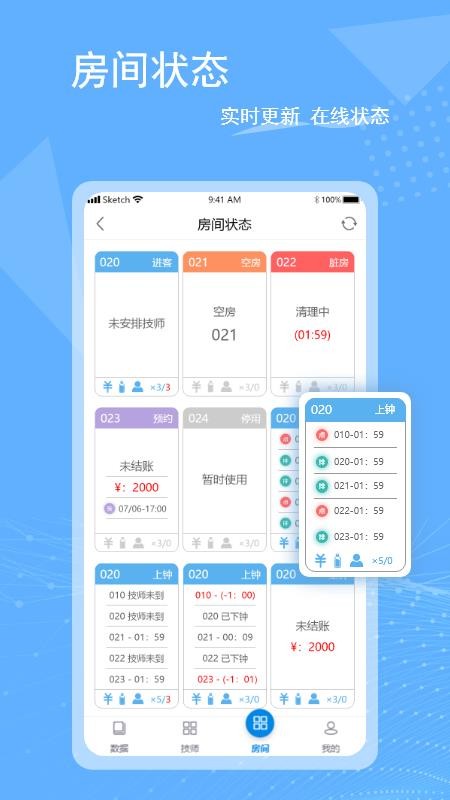 3.房间详情:提供安排上钟和项目明细等功能,方便管理者安排房间使用。