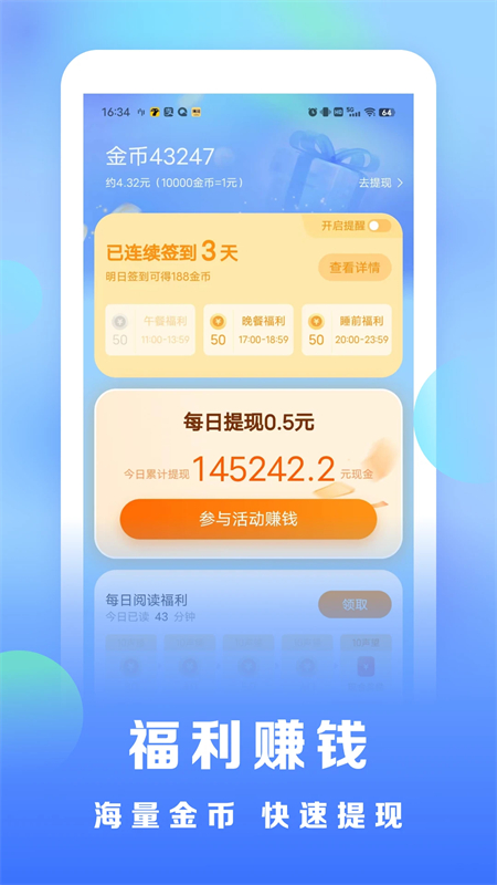 签到福利,金币福利,阅读福利等各种福利应有尽有,随时提现,只要你每天常来读。