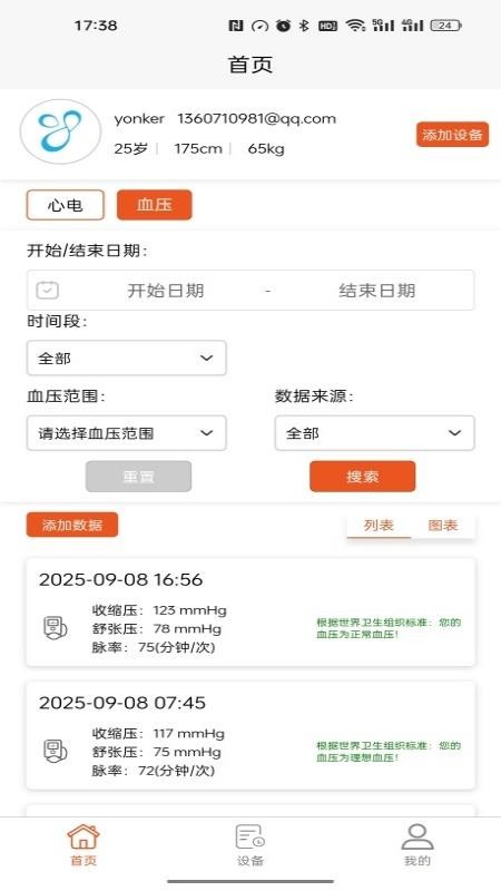 应用会同步健康设备上的检测数据,并保存检测数据趋势,提供个人健康评估预测。